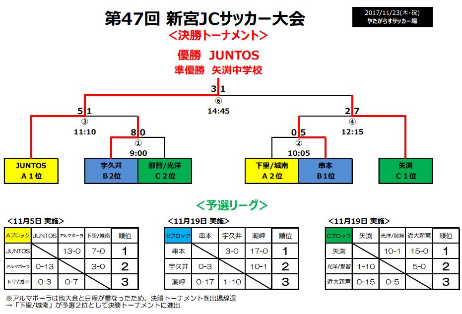11/10(土) @やたがらすサッカー場第48回 新宮JCサッカー大会・予選リーグ<第1節>JUNTOS 8-O 那智中/光洋中(前半4-0 / 後半4-0)【得点】瀬川、那智、楠本、赤﨑、出会②、大石、速水<第2節>JUNTOS 5-1 宇久井中/近大新宮中(前半4-0 / 後半0-1)【得点】山口②、瀬川②、上地決勝トーナメントは11/23(金・祝)@やたがらすサッカー場で開催となります。新宮青年会議所の皆様方のご支援とご協力の下、今回で48回目を迎える歴史ある大会です。新宮青年会議所の皆様、どうぞよろしくお願いいたします。