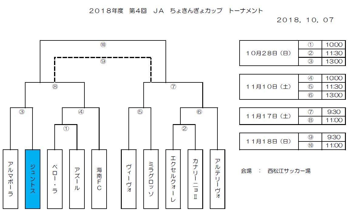 10/28(日) 1回戦 @西松江サッカー場JUNTOS 18-0 三佐木アルマボーラ(前半7-0 ,後半11-0)【得点】※カッコ内はU12所属峯本⑤(那智勝浦FC)平谷⑦(那智勝浦FC)山本(那智勝浦FC)大谷(王子サッカー教室)〆谷(王子サッカー教室)久保(宇久井SSS)植地②(新宮SSS)