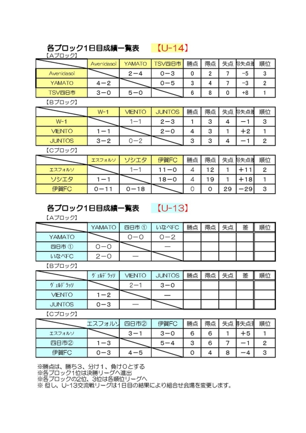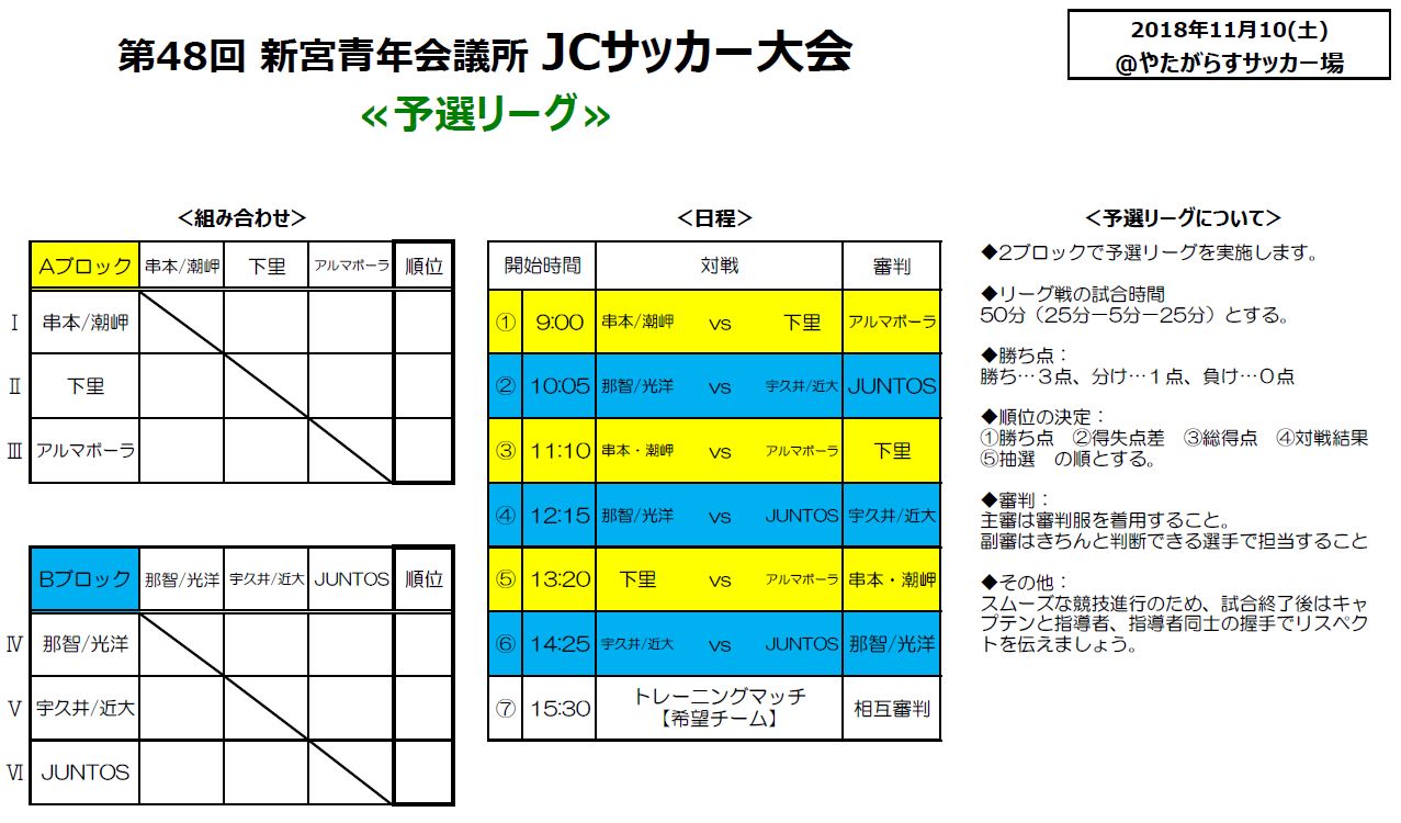 11/10(土) U14/U13内 容: 第48回 新宮青年会議所JCサッカー新人大会・予選リーグ会 場: やたがらすサッカー場対 戦: ①12:15~那智/光洋中学校、②14:25~宇久井/近大新宮中学校集 合: 9:30現地集合解 散: 17:00 現地解散持ち物: 公式ユニのセット、サッカー用具、昼食、ドリンク参加費: なし送 迎: なし-------------------------------------------------------------------------------